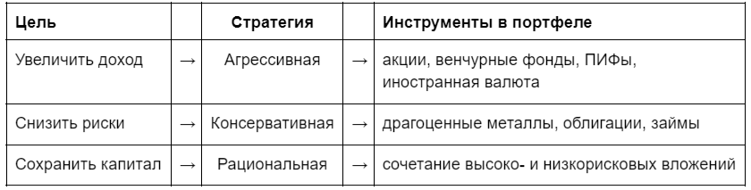 От того, что важнее для инвестора — увеличить доход или снизить риски — зависит его стратегия. Она может быть агрессивной, консервативной или рациональной. Стратегия формирует инвестиционный портфель.