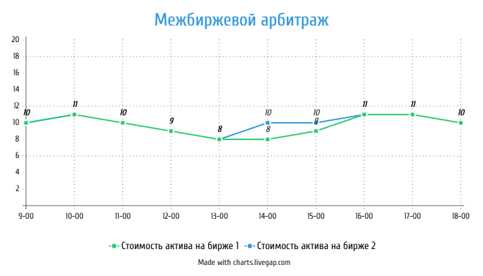 Межбиржевой арбитраж — это сделки с активом на разных биржах при условии, что цены на него расходятся. В этом случае инвестор покупает дешевый актив на одной бирже и продает его по ценам выше на другой.
