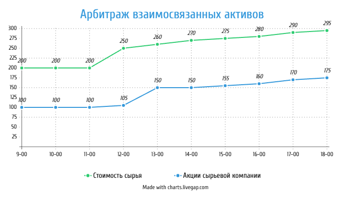 Арбитраж на взаимосвязанных активах — это биржевая стратегия, которая предполагает, что цены на однотипные активы меняются по схожим трендам. Если стоимость одного актива поднялась, то цена на другой, связанный с ним, тоже в скором времени вырастет. Если купить второй актив заранее, можно получить выгоду.