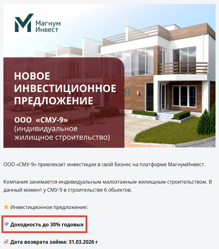 Например, выбирать инвестиционную платформу с узкой специализацией. МагнумИнвест сотрудничает с заемщиками-застройщиками, входящими в девелоперские группы компаний. Для инвестора преимущество в том, что платформа не пытается охватить все отрасли экономики, а сосредотачивает компетенции в скоринге заемщиков из строительной отрасли и оценивании перспективности проектов строительства жилых комплексов. Доходность составляет до 30% годовых.