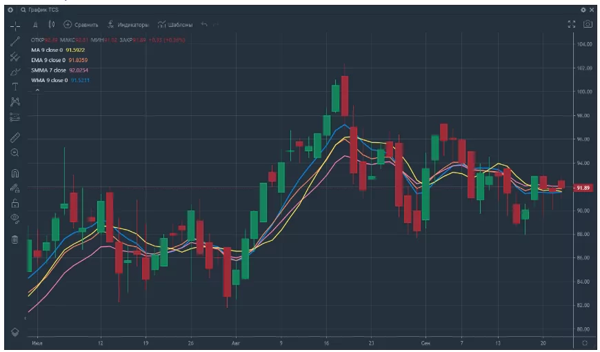 Примеры графиков различных видов скользящих средних в Терминале Т-Инвестиций. Источник: Индикаторы технического анализа — TINKOFF INVEST API
