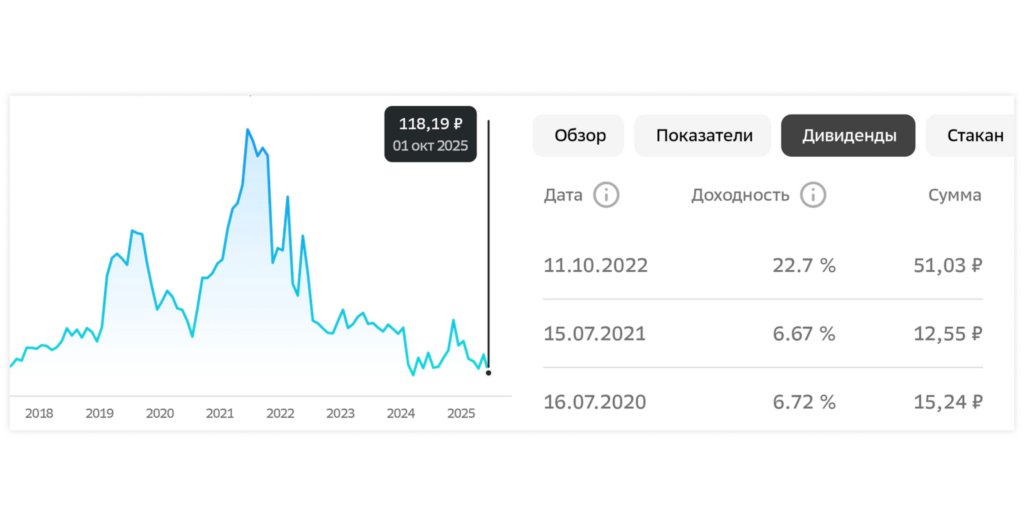 На октябрь 2025 года акции Газпрома продолжают падать. С 30 июня 2022 их стоимость снизилась на 179,46 рублей, а итоговые дивиденды так и не выплачивались. Источник: СберИнвестиции