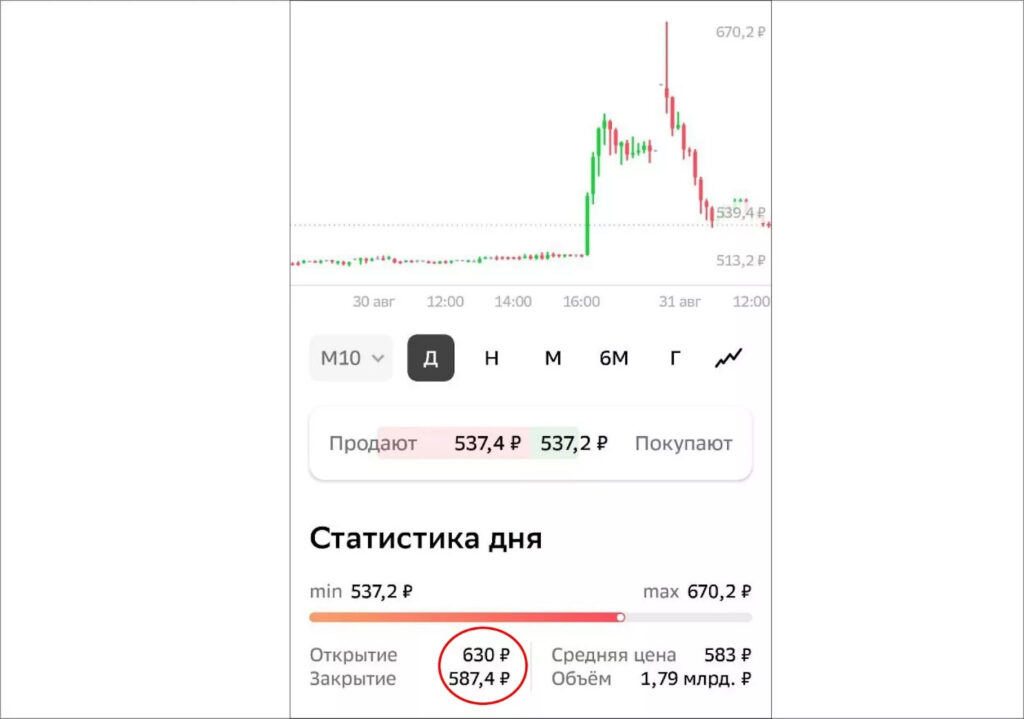 Обзор торговли акциями ЭсЭфАй в инвестиционном приложении брокера. Показывает волатильность цены в течение биржевого дня. Источник: СберИнвестиции